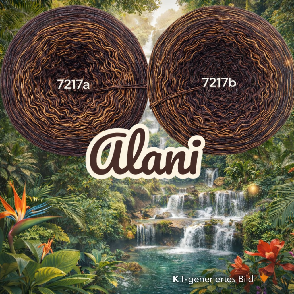 Die Farbwelt Alani vereint tiefe Braun- und Karamelltöne mit feinen, warmen Akzenten und erinnert an feuchte Erde, Holz und goldene Sonnenstrahlen im dichten Dschungel. Inspiriert von tropischer Natur entsteht ein ruhiger, zugleich kraftvoller Farbverlauf mit natürlicher Eleganz.