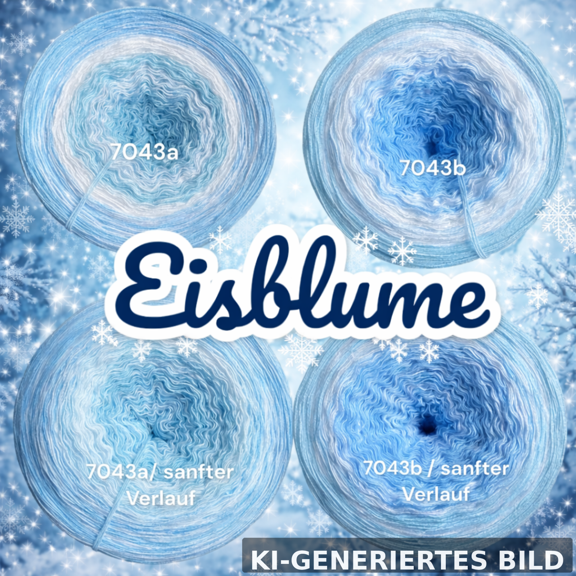 Die Farbwelt „Eisblume“ erinnert an filigrane Frostmuster an Fensterscheiben und die stille Schönheit eines klaren Wintermorgens. Sanfte Weißtöne verschmelzen mit kühlen Blau- und Eisschattierungen zu einem ruhigen, eleganten Farbverlauf voller Leichtigkeit.
