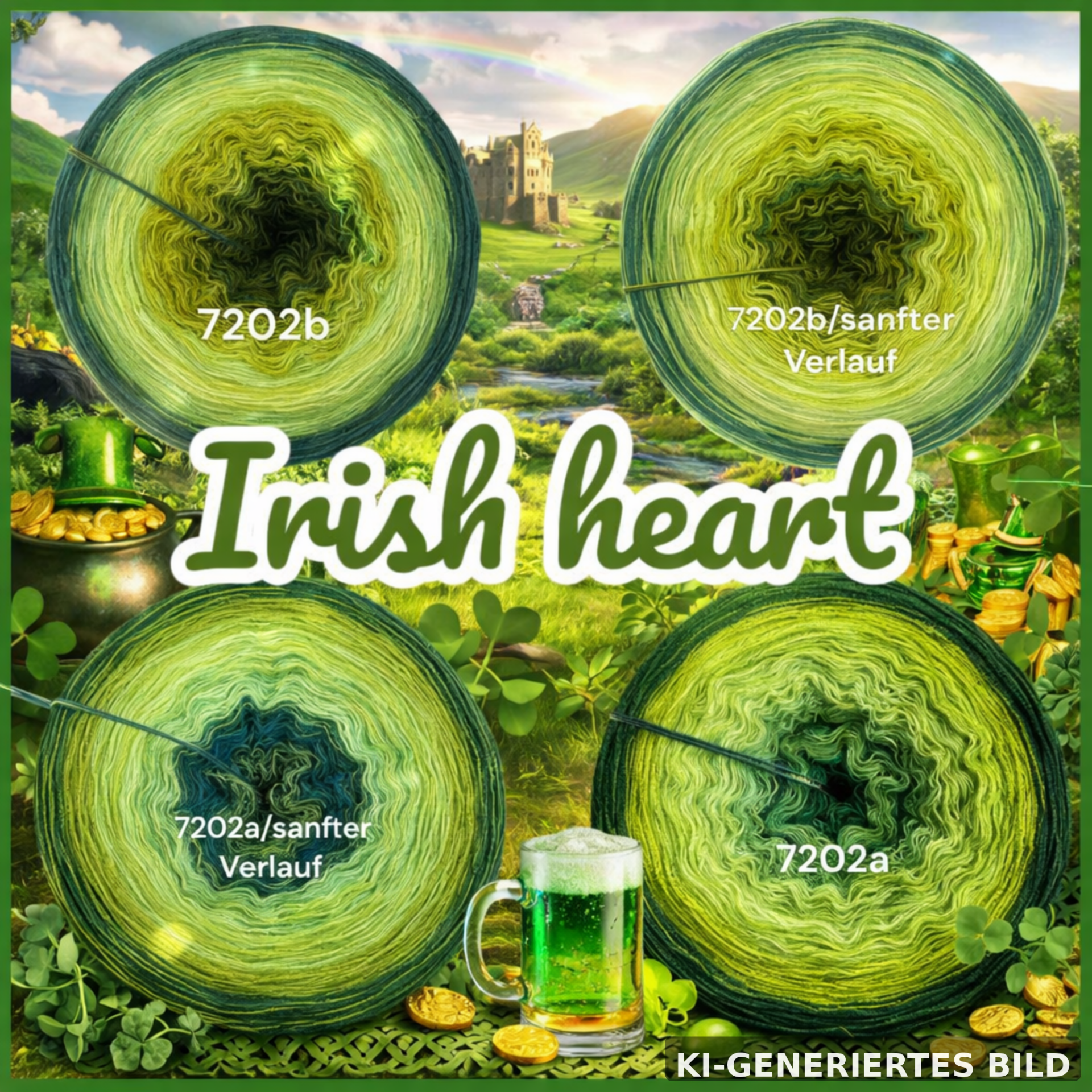 Die Farbwelt „Irish Heart“ ist eine Hommage an die lebendige Natur Irlands. Verschiedene Grüntöne – von sattem Waldgrün über frisches Frühlingsgrün bis hin zu leuchtenden, fast goldenen Nuancen – verschmelzen zu einem harmonischen und zugleich ausdrucksstarken Farbverlauf.