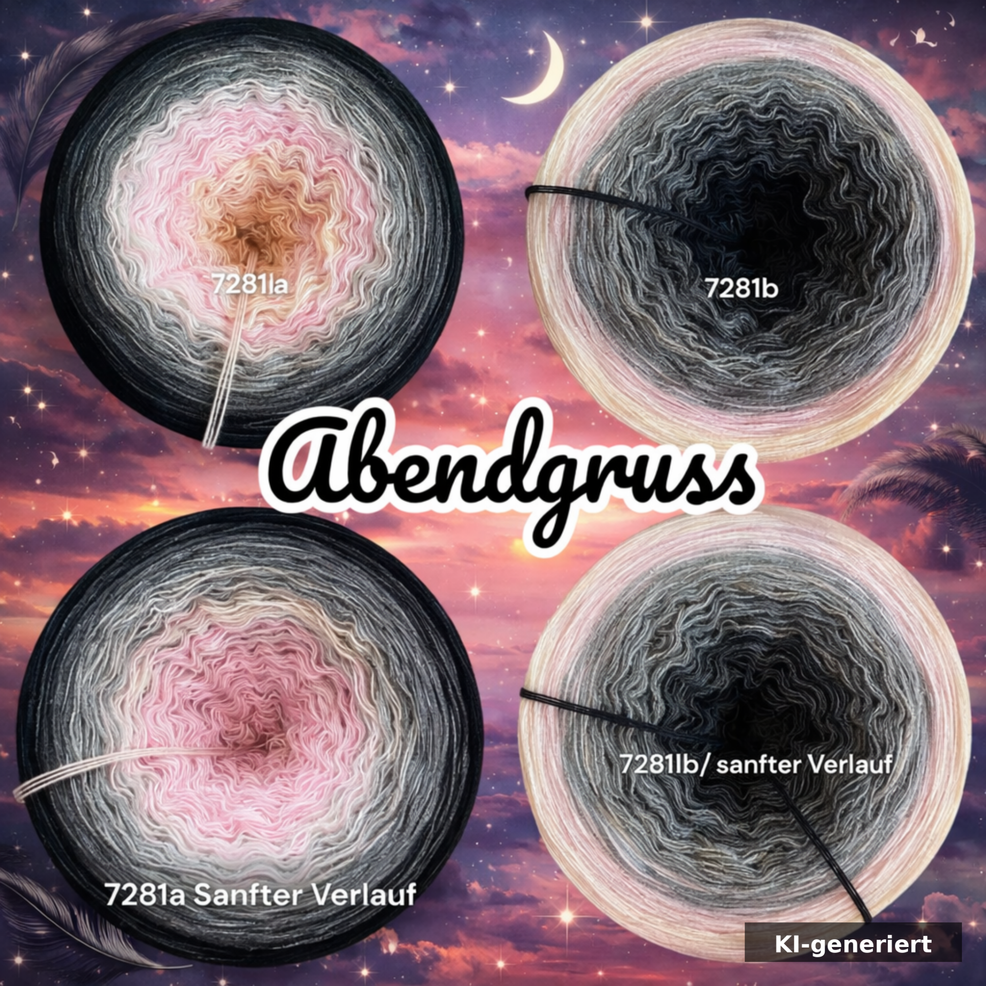 Die harmonischen Farbverläufe wirken ruhig und elegant – wie ein weicher Übergang vom warmen Abendhimmel in die geheimnisvolle Dunkelheit. Helle, zarte Töne stehen im Kontrast zu tiefen, dunklen Schattierungen und verleihen dem Garn eine besondere Tiefe und Ausdruckskraft.