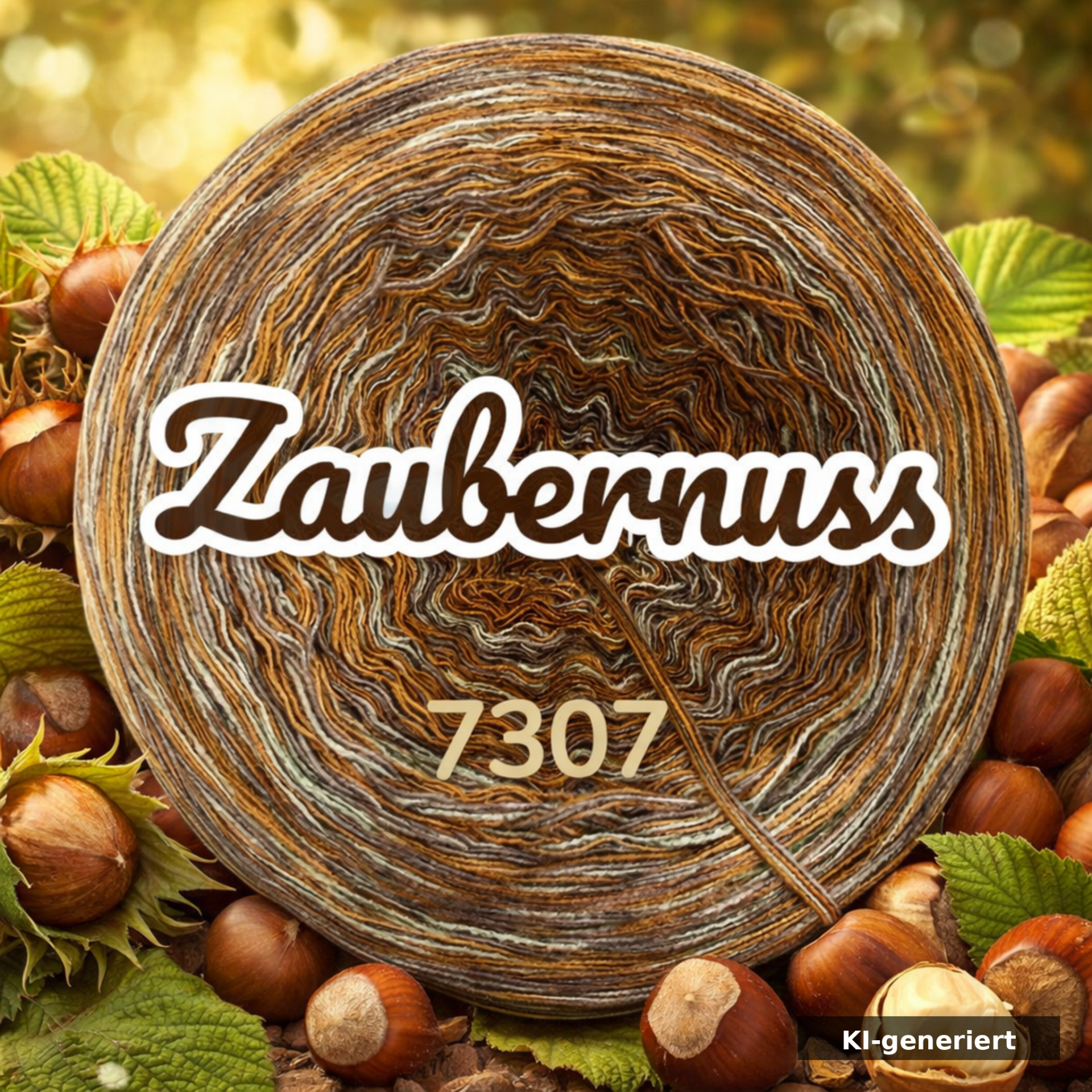 Die Farbvariante „Zaubernuss“ vereint warme Braun-, Karamell- und Naturtöne zu einem harmonischen Gesamtbild. Feine Nuancen von Beige und sanften Grautönen durchziehen den Verlauf und verleihen dem Garn eine natürliche, fast rustikale Eleganz.