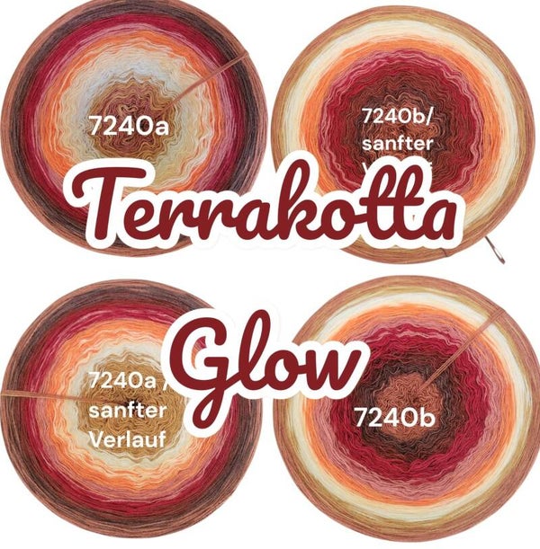 Beim Stricken oder Häkeln zeigt sich die ganze Schönheit dieses Garns: Die Farben gleiten weich ineinander und lassen jedes Projekt wie von selbst wirken – dynamisch, elegant und voller Tiefe. Ob gemütlicher Schal, ausdrucksstarkes Tuch oder ein besonderes Lieblingsstück – „Terrakotta Glow“ verleiht jeder Masche Wärme und Charakter.